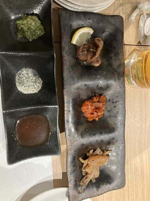 お通しは3種類、松前漬け、きんぴらごぼう、キムチ、このキムチの味好きだわー。