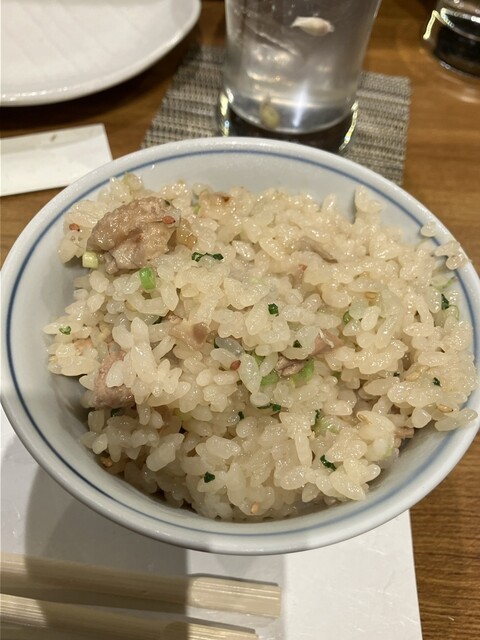 地鶏と生姜の土鍋ご飯、生姜はアクセント、メインは地鶏とその出汁、混ぜていただく、まじウマ、一人一合くらいあるとのこと、お腹に余裕持たせてチャレンジしてください。