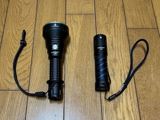 全長 164mm、ヘッド径 60mmというやや大きなサイズで、MAX 1650ルーメンの光束です。以前ここに記した同じAcebeamの E70と比べるとヘッドが格段に大きく、光束は約3分の1。E70が広範囲をまんべんなく照らすのに対してL19の特徴は長距離照射能力でその距離は公称1300メートルだそうです。