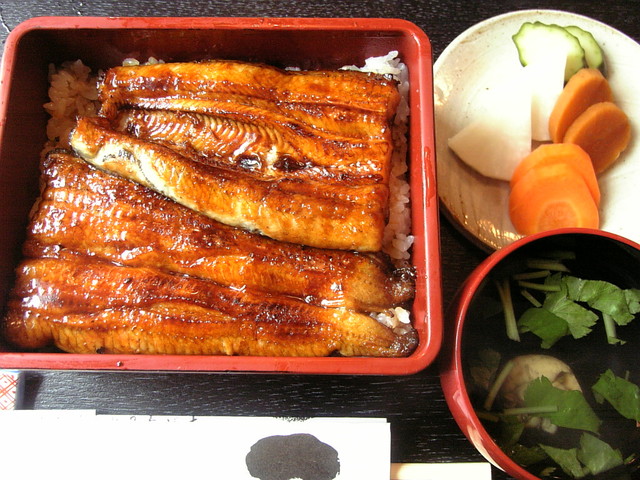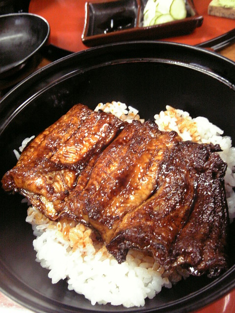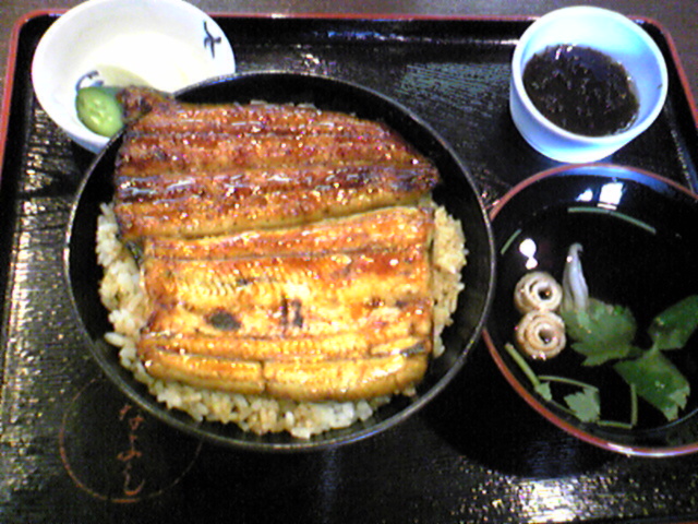 初めて食べたときのインパクトは今でも鮮明です。理屈でなく、とにかくウマい!と感じました。身は大きく肉厚のものを関西風で焼き上げています。焼きは乱暴で多少の焦げはなんのその、それでも仕上がりは、外がパリッ、中はジューシーで脂の乗りが絶妙です。たれはやや甘目ながら独特の旨みがあり、強い身とのGoodバランスで一気に平らげてしまいます。肝吸いの肝は少し炙ったワイルドな風味、漬物は大根と菜っ葉?がステキ。ゴハンも銘柄は忘れたけれど、べたべたしない品種を使っておりなかなかのコンディションです。タレのかかり具合や焼きも少々ラフでバラツキがあるように思いますがこれもご愛嬌。