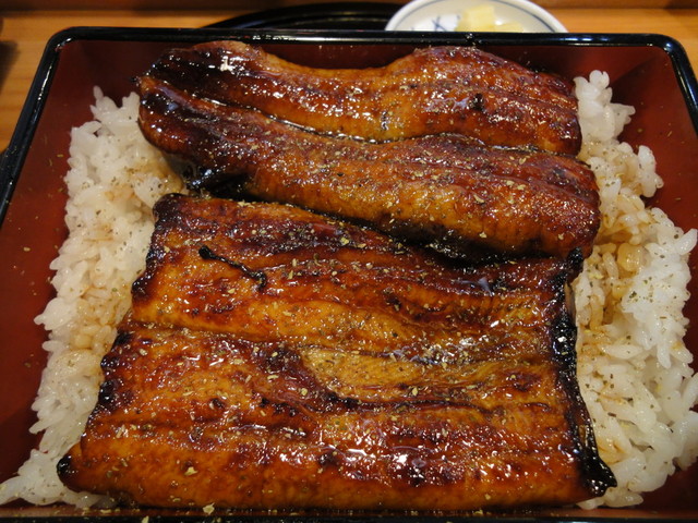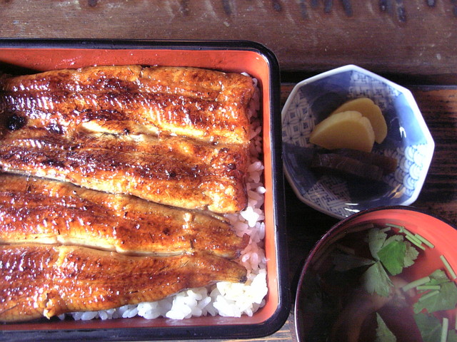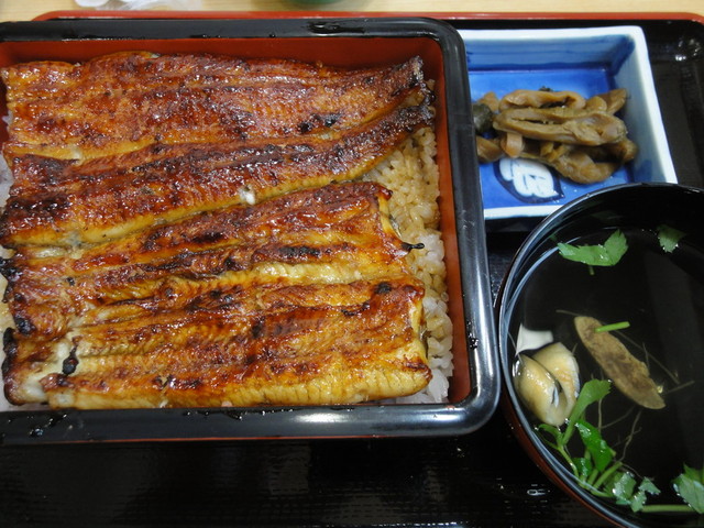 うな重の竹、2000円と梅1500円を注文。備長炭で焼くうな重が出てくるまで20分くらい待って、蓋を開けるとキレイな蒲焼が鎮座ましましていてテンションが上がる。しっかりと焼が入っていて中がしっとりやわらかいタイプ。極厚ではないながらも十分満足できる上質な身で大きさの割りに脂の味もしっかり味わえる。こういう身に出会うと、うなぎはデカけりゃいいってモンじゃないなあとつくづく思う。タレは甘さをおさえたやや辛めか。全体的にレベルは高く、好みで言えば三島地区(ほぼ箱根だけど)では上位だ。梅はうなぎが1.5枚ではあるがゴハンがしっかり入っていて得感がある。ただし梅の吸い物には肝が入らない。