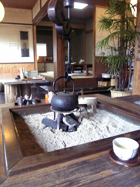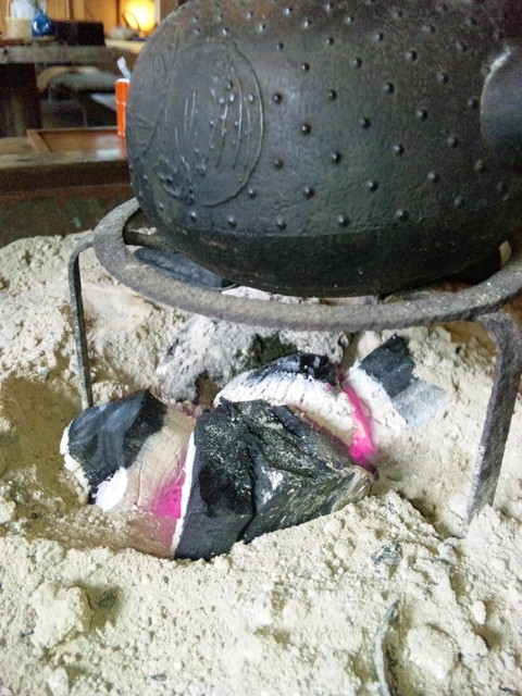 店は、囲炉裏席と天然木の食卓、それと座敷もある。山の中なので大変雰囲気が良く、混雑とも無縁で実に落ち着く。囲炉裏席に座った。今日は囲炉裏の炭に火が入っていた。囲炉裏の卓が低く、実用的にはテーブルに劣るけれど、そこはご愛嬌。