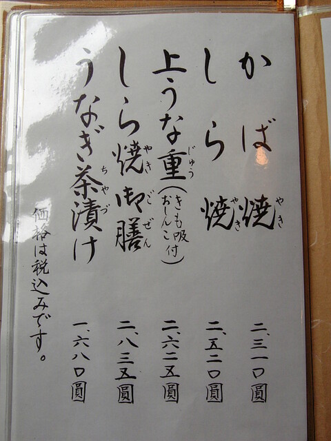 メニューは特上(といってもこれが1尾分のいわゆる並)が2300円。こちらも2011年6月より値上げを余儀なくされたようです。ほかに特々上、肝焼き、うなぎのあらい、鮎・ヤマメの塩焼き、沢蟹のから揚げ。