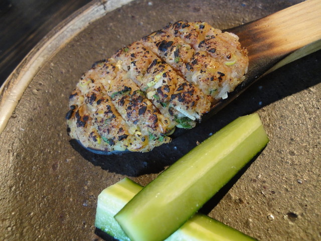まず、陶器の器に入った蕎麦湯が出ます。香り豊かなそば湯です。注文はみそ焼き、せいろ、天ぷら盛り合わせ。まずみそ焼きが来ます。濃い目の味付けで焼き目が非常に香ばしい。こちらの焼きみそは何度か注文しましたが、季節季節の旬の素材が入っているようです。添えられたきゅうりとよく合います。天ぷら(小;900円)は海老2本、茗荷、アスパラ、ナスなどの野菜と舞茸、シイタケなどで、2人でシェアして食べるのにちょうどいい量です。素材は新鮮で滋味に富んでいて、これをごま油であげているのでとても香ばしくサクサクしています。900円はお値打ちでしょう。それからそば。つるっとしたコシのあるそばでのど越しがとてもよろしい。惜しむらくはそばの香りがやや弱かったこと。つけ汁は濃い目で、ダシの煙風味が立ってつるっとしたそばとの相性がよいです。