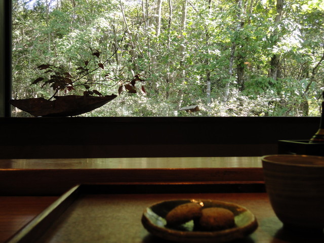 謳い文句のとおり和モダンの外観です。黒い木壁と白壁とのアクセントは清潔で清々しく高原の景色にマッチしています。入り口で靴を脱いで入店すると、右手に6脚のカウンター席。ここがこのお店の白眉で、カウンター席に掛けると正面が大きなガラス窓になっており自然林が間近に望めるのです。林の中に小鳥の餌付け台があり可愛らしい鳥たちが餌をついばみに来るのをぼんやり眺めているだけでもかなり癒されます。これはきわめて素晴らしい趣向です。