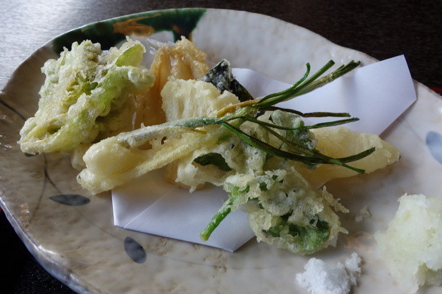 天ぷらはアブラナ、ウド、ノビル、フキノトウの春の葉っぱたちとキス天。