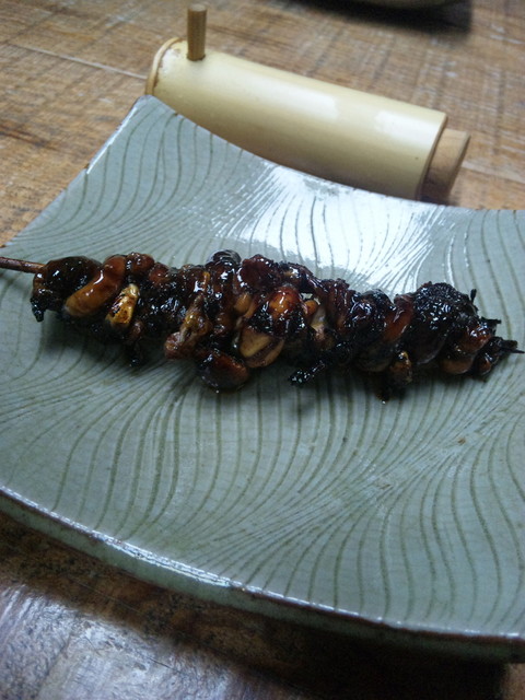 10分ほどで肝焼きが来ました。串になっていて割りと大振りの肝が連なっています。食感は柔らかく、かなり苦味が効いていて大変おいしい。サザエなどの巻貝系の先っぽの部分があるでしょう。あそこの感覚にちょっと近いものを感じました。