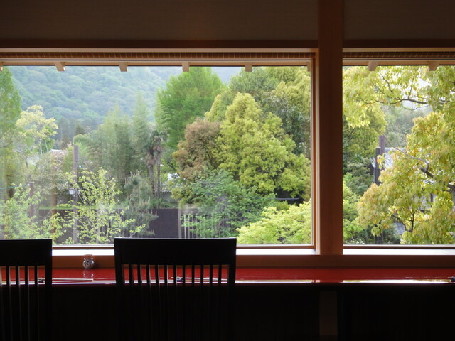 予約の10分ほど前に到着し名前を告げると2階へと通されます。2階には個室が二つ、半個室が一つ、テーブルが二つ、それと通り側に面したカウンター席があります。大きく切られた窓からは嵐山の新緑が両手で抱えられるように見られます。シックな内装と相俟って、これほど贅沢で、静かで落ち着く空間を、私はうなぎ屋さんでは他に知りません。
