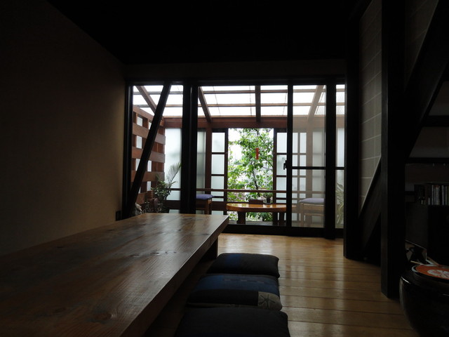 店内は正面にカウンターが5脚と左手の板の間の小上がりに4人座卓が4つです。こちらの小上がりは大きな窓が切られ緑を眺めながら食事を楽しめます。天井が高く、清潔な落ち着ける構造です。