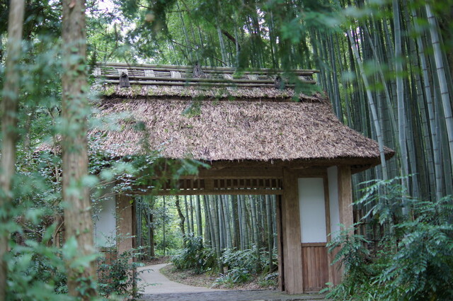 駐車場から案内板に沿ってとらや工房の入り口に向うと竹藪に囲まれた茅葺の山門が見えます。私はこのアプローチが大好きです。趣のある山門をくぐり、小径をゆっくりと散策するように進むと左手がとらや工房、右手に進むと東山旧岸邸へ。旧岸邸は、岸元首相が晩年をすごした邸宅で、建築家吉田五十八の作品とのこと。入館料を支払えば見学できます。