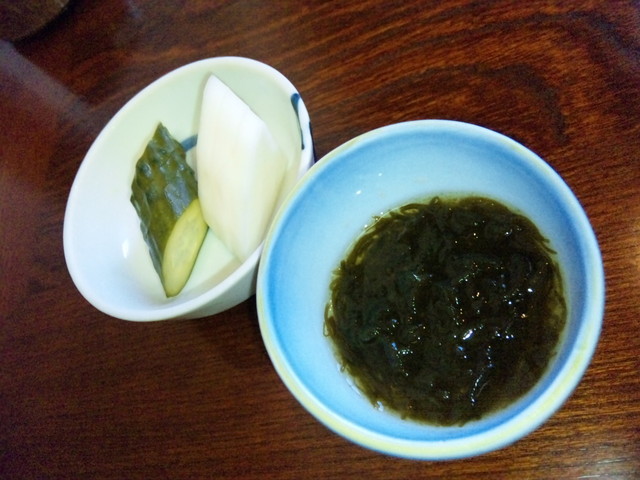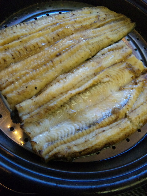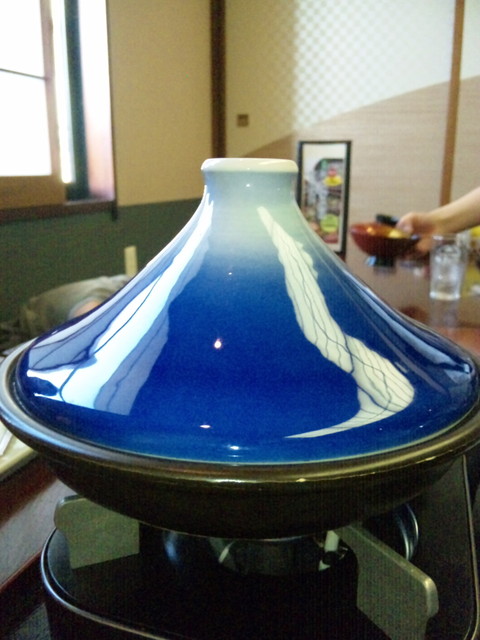 白むしは富士山型の土鍋で供されます。カセットコンロのとろ火で温めているので冷めません。相変わらず大きめな身で脂がよく乗っていて、適度な蒸しによるいい塩梅の柔らかさ。ただ、かなりくさみが強く感じられ、私は許容範囲でしたが、気になる人も多いレベルではないかと思いました。