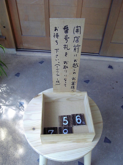 一番初めの訪問時は、混雑を予想し早めの行動で11時頃に着きました。店の前に番号札が置いてあり、一グループに一枚どうぞ、と札が出ていました。待っていると順番がわからなくて困ることがよくありますがこれなら一目瞭然、余計な気を遣わなくていいのでありがたいですね。今日は2番札を取りました。それと小さなお子様はご遠慮くださいの札も。小学生はOKかNGか微妙ですね。