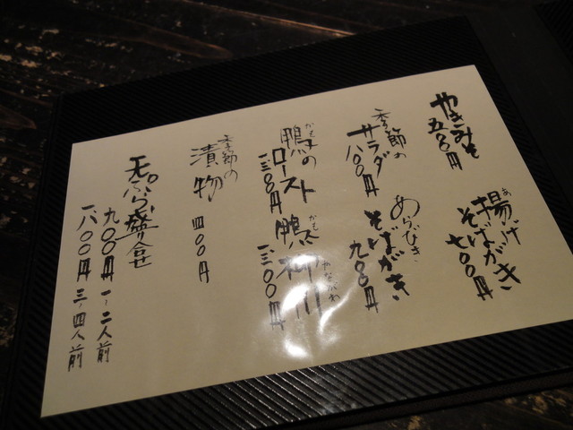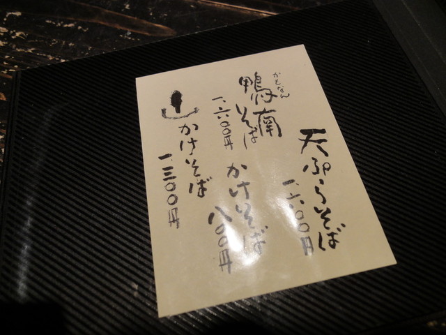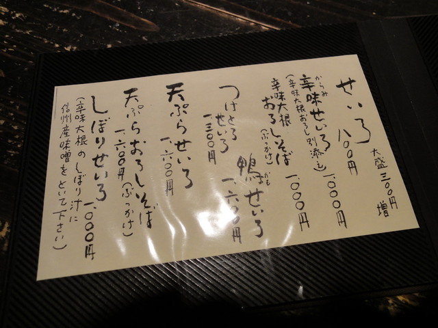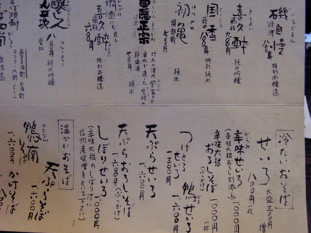 主なものは、せいろ800円、天せいろ1600円、鴨せいろ1600円。大盛りは300円増し。かけもあります。一品類は焼きみそ500円、鴨ロースト1300円、天ぷら盛り合わせ大1800円、小900円といったところでしょうか。日本酒も数種類あり、一品をアテにして蕎麦で仕上げるというシアワセな設計図が描けます。*2011年4月時点。