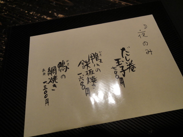 夜は予約のみということで他のお客も1組だけで印象は昼とは随分違います。静かで、薄暗くてとてもいい雰囲気の中、極めてゆったりと食事ができました。この風情は得難いものがあります。オススメです。昼に対し、雰囲気店を加点しました。