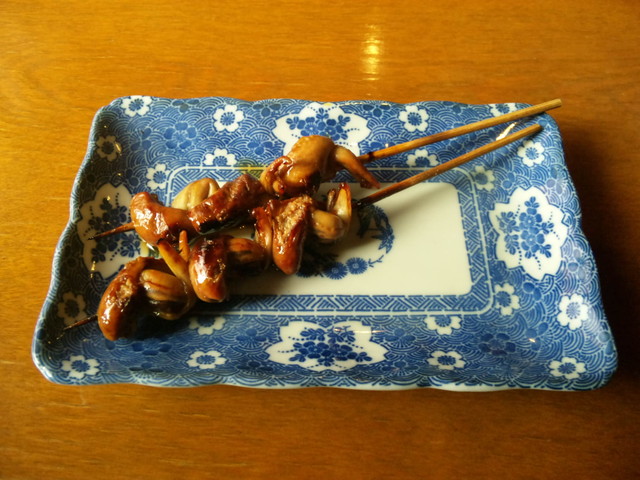 まず肝焼き。肝が3ケの串が二本。大変にあっさりしたタレが肝の持つ旨みを引き立て大変にうまい。今までに食べたこのない種類の味。