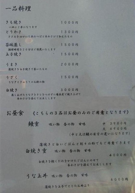 昼のメニューは、鰻重の大、小、白焼き重、うな玉丼、そして特選鰻重。特選が5000円、鰻重の大が4900円、他が4000円と値はそれなりに張る。特選は養殖の2年ものだそうだ。特選と白焼き重、肝焼きを注文した。またこちらは酒類のメニューが豊富で、ビール、日本酒のほか、ワインやシャンパンなどもランナップしている。連れは白ワインをチョイス。