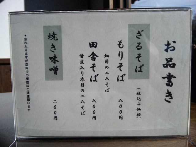 メニューは恐ろしくシンプル。もりそば、田舎そば、焼味噌。以上。裏返すとドリンクメニューで吟味された日本酒が数種類あるのが目を引く。酒を注文すると焼き味噌が一つ突き出しに付いてくる。もり、田舎、焼味噌と冷酒(長野・大雪渓)を頼む。酒はガラスの美しい器に入って出てくる。