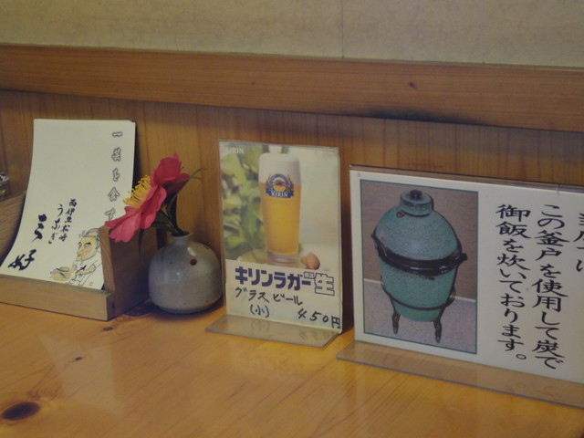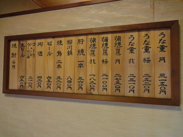 品書きはうな重の量違い、蒲焼、白焼きの量違いおよび肝焼き、焼き鳥、柳川鍋。極めてシンプルです。一般的に地方のこの手のうなぎ屋さんは他の和食メニューもラインナップしていますが、こちらは専門店としてこだわっているようです。好感が持てます。うな重の花(並)2310円、白焼きの花1890円と肝焼きを注文します。