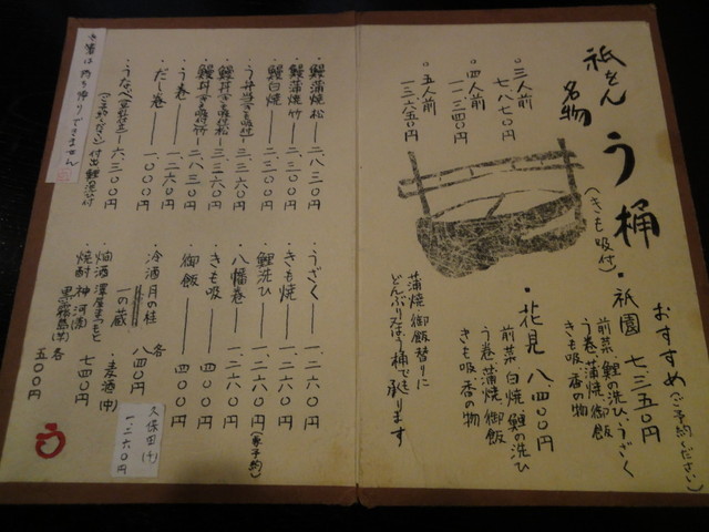 ご存知う桶が3人前、4人前、5人前があります。ほかに蒲焼、白焼き、うな丼、う巻、うざく、肝焼き、だしまきなど一品料理。4人桶11340円と白焼き2300円、だしまき1000円、肝焼き1260円を注文しました。