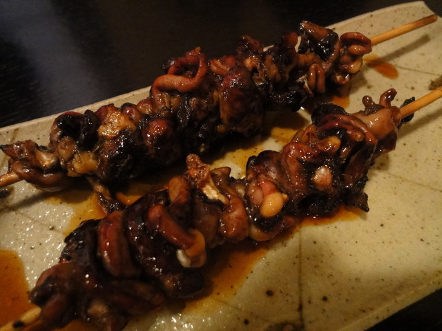 肝焼きは内臓1式が串に連なっています。蒸しが入っているのか、レバー部などはとろんとして大変おいしかった。絡んだタレが非常に甘さを控えたもので肝の味を引き立てます。アテには最高です。だしまきは京都らしく、余計な味付けをしていないシンプルでふわとろな玉子焼きでした。大根おろしでいただきます。白焼きは小ぶりながら臭み・小骨が極めて少なくふわっと柔らかい仕上がり。だしまきも白焼きも飢えた鬼たちの箸が止まらず一瞬で食卓から消えました。