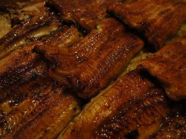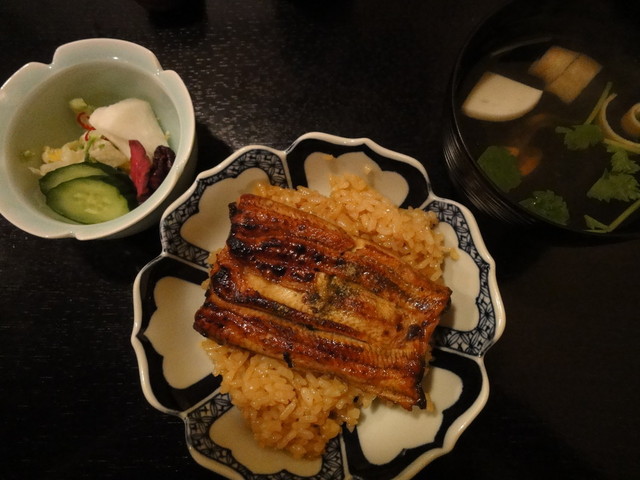 さてお待ちかねの桶です。仲居さんが桶の蓋を開くとシアワセがカタチになって現れます。4人前なので半身が8枚ズラッと並んでいて壮観!!これを仲居さんが器用に取り分けてくれます。蒲焼はやや小ぶりながら脂の乗った上質な身で深蒸しのふわとろ。タレは甘さを控えたさらっとしたもので、完全な江戸好みです。これもまた、おいしくて皆であっという間に平らげました。正直これほど旨いうなぎにありつけるとは思っていませんでした。肝吸い、お新香も4人前付きます。これら脇役も上々でした。