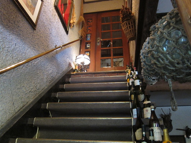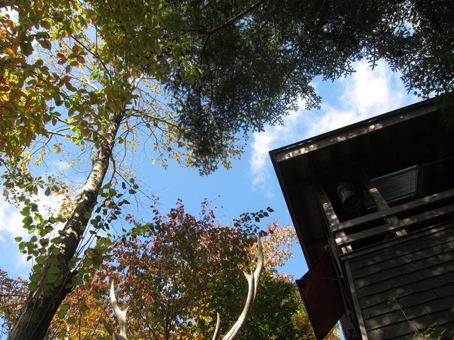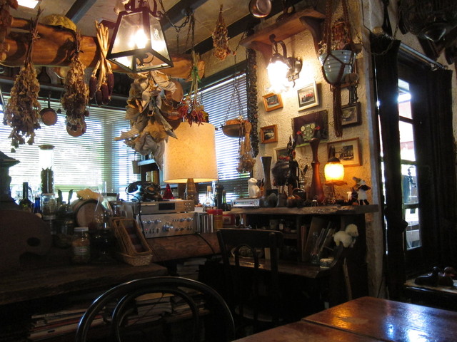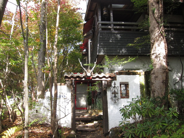 林の中の別荘風の二階建てで、建物自体は相当古いようです。入り口に小さな門があり牛の角がかかっていたりします。店内は1階が待合とトイレ。待合は総じてこたごたといろいろなものが置いてあり、船の舵や、バイク、鹿の頭の壁掛け、絵画・・・。そして、さすが高原。もうストーブに火が入っていました。
