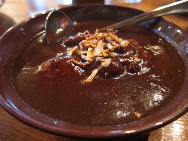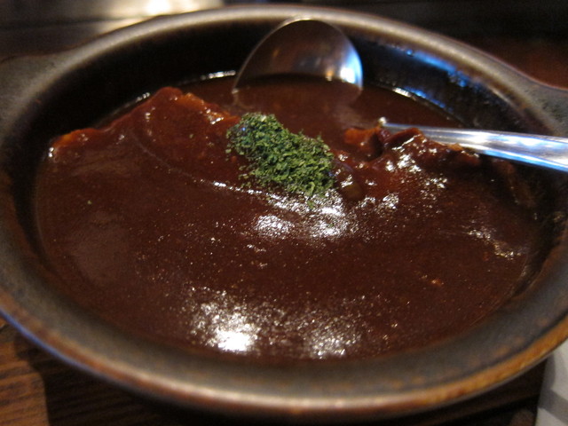 さて、食べログの写真を見るとやはりベーコンエッグが絵的には迫力があるのですが、私は「旨いものはメニューの一番上に書いてあるの法則」からポークカレー1600円をチョイス。辛さは辛口のC、ゴハンはM。連れは限定のスネ肉煮込み1600円を。