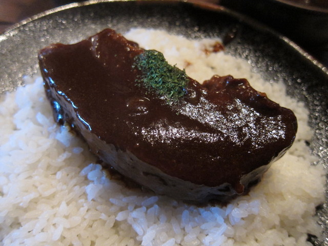 まずこの肉塊をゴハンの上に乗せてみます。そしてスプーンで切ってみると苦もなく千切れます。口に運ぶと豚肉本来の香りと脂身の甘さが広がりました。ああ、旨い。やはり「旨いものはメニューの・・・」の法則は当たったじゃないか、と一人で得心。カレーソースはまずはじめにスパイスと甘みを感じ、最後にピリッと辛さが来ます。後味も口に旨みが残って爽やか。これもおいしいではないですか。