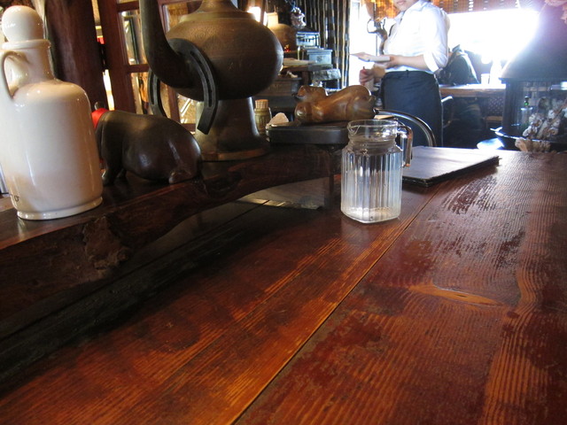 受付機に番号を呼ばれて2階へ。二階の客席は待合よりさらに色々な装飾品に溢れていました。ここにも鹿の頭、虎の毛皮、写真、小物たち。あまり気にしない方がいいようですね。造作自体はロッヂ風のちゃんとした造りでかつ年季が入っています。