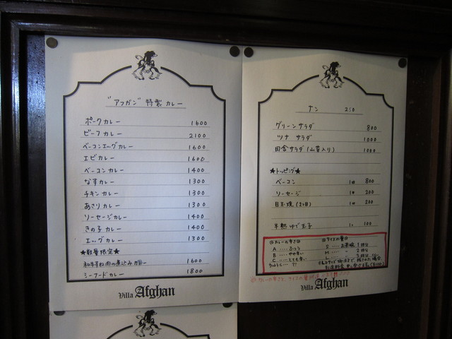 ポーク、ビーフ、ベーコンエッグ、エビ、ベーコン、ナス、チキン、アサリ、ソーセージ、キノコ、エッグから選べます。数量限定としてスネ肉煮込み、シーフード。辛さはA、B、CとウルトラCの4種類、ゴハンの量はS、M、Lの3種類から選べます(価格は同額)。トッピングも可能でベーコン、ソーセージ、目玉焼きを追加で乗せられます。