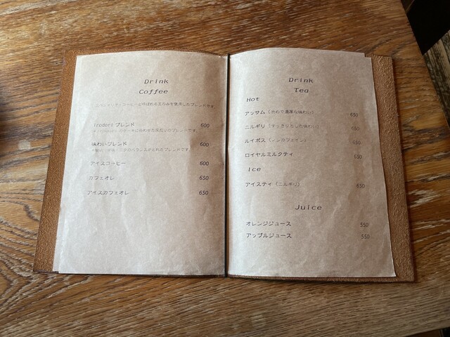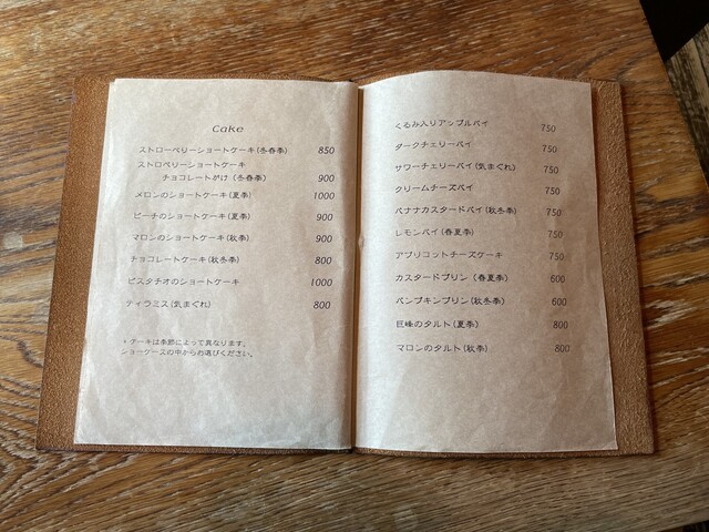 ショートケーキ・パイ・プリン・タルトなどをラインナップし季節感が楽しめる旬のフルーツを用いたケーキ類がウリ。今回は栗のケーキが並んでいました。オーダーはショーケースにあるものから選びます。価格帯は750円から1,000円と静岡の相場からするとかなり思い切った値付けです。ドリンクはコーヒー、紅茶が600円から650円。