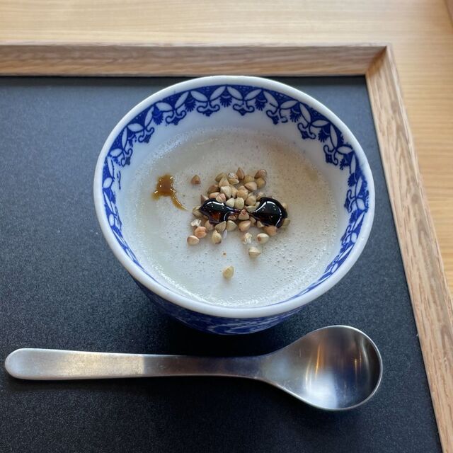 デザートにオーダーした十割蕎麦プリンはカリっとした蕎麦の実と黒蜜、ねっとりとしたそばがきのような風味満点の極上スイーツでした。