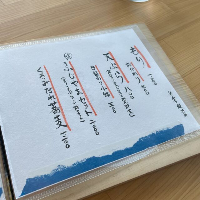 メニューはもり 1,000円、おかわり 700円、天ぷら 800円、日替わり小鉢 300円、ふじやまセット(もり、天ぷら、小鉢のセット) 2,000円、くるみだれ蕎麦 1,200円、十割蕎麦プリン 300円。つまり、食事は蕎麦と天ぷらのみの実に潔いラインナップです。私はもりと天ぷら、十割蕎麦プリンをオーダーしました。