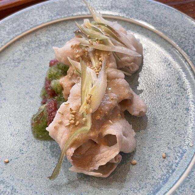 二品目はイチジクのワイン煮。旬のイチジクの甘さが引き立っていました。次にそばがき。炙ってあるため香ばしさとそばの風味が存分に楽しめ、甘辛の醤油麹のあんが絶妙。メインは地元ブランド豚の冷しゃぶです。柔らかく旨味の強い豚肉に薬味のミョウガと酸味のあるソースがとてもよく合っていました。そして、ランチでも提供している絶品ニジマス天ぷら、そば、甘味のそばプリンと続きます。そばも相変わらずの旨さでした。