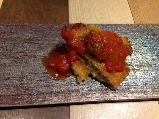 ・ポークの大葉チーズカツです。こちらも鉄板で焼いてくれるのですが、チーズのいい香りがたまりませんね。トマトソースとの相性もよかったです。
