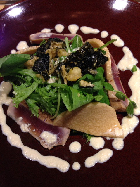 ・お魚を軽く焼き目をつけたものたと、お野菜、山芋を和えたサラダタイプの前菜でした。時折サクサクした食感は、なんだったのか…アクセントになっていて美味しかったです。