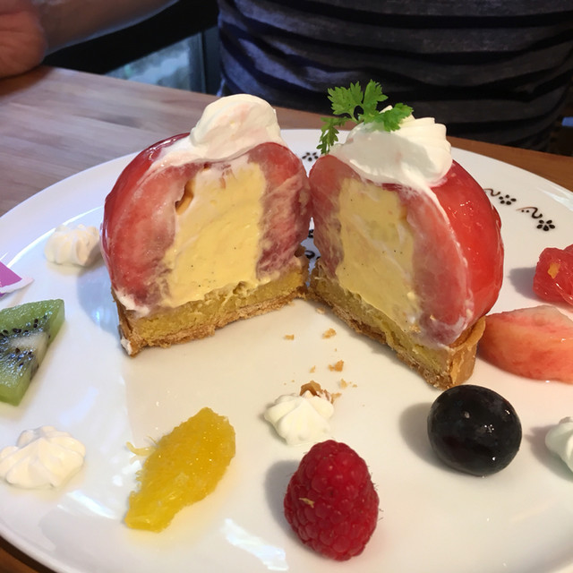 桃はジューシー、中身はとろけるカスタード、土台はタルトで、主人どストライクのケーキみたいでした。