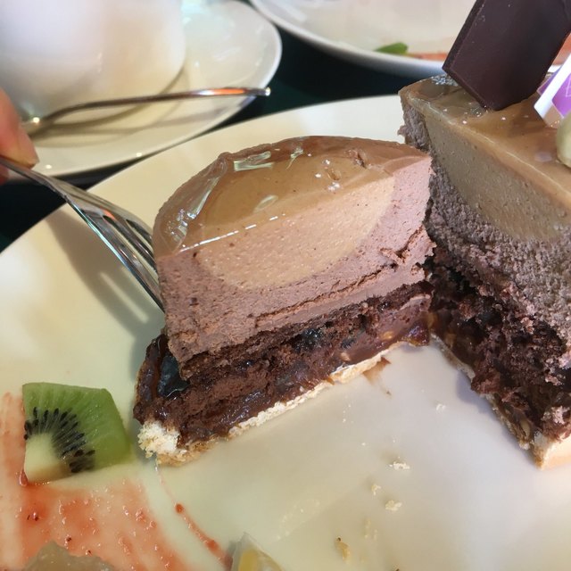 チョコムースケーキです。ほぼチョコムースで構成されていますが、くどくなく、時折ベリーのソースを感じるので最後まで飽きずにいただけます。美味しいです!