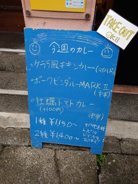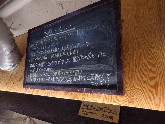 まず1種盛りか2種盛りかを選び、黒板に書かれている日替わり3種の中から選ぶスタイル。本日はケララ風チキンカレー、ポークビンダルーMARKⅡ、牡蠣トマトカレー(+100円)だったので、チキンとポークの2種盛りといちごラッシーを注文しました。