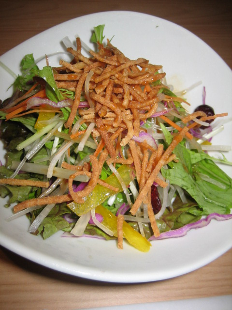 サラダには油で揚げたお蕎麦をトッピングして香ばしい風味を