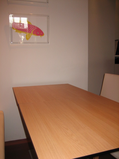 と店内も紅白を基調とした内装、シンプルな印象のテーブルと