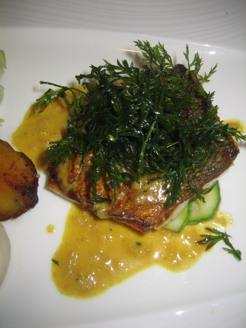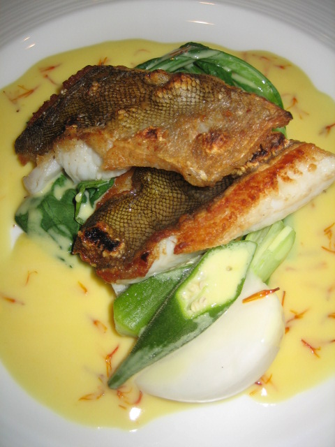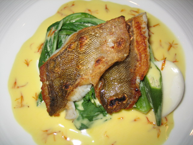 メインは日本海産アイナメのポアレ&紅花ソース、デセールはサンマルク、ドリンクにコ