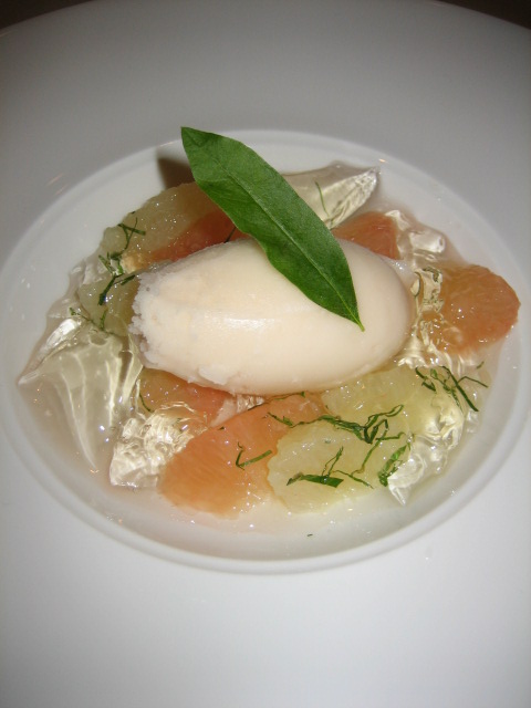デセールにはフルーツのソルベ、カヴァをシロップにブレンド、ハーブのベルヴェンヌ