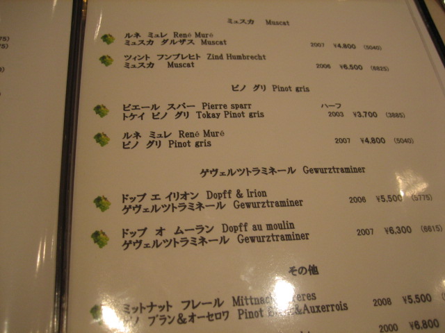 でしたが、実際メニューを見るとリースリング、ゲヴェルツトラミネ-ルなどアルザス地方産