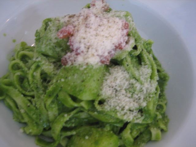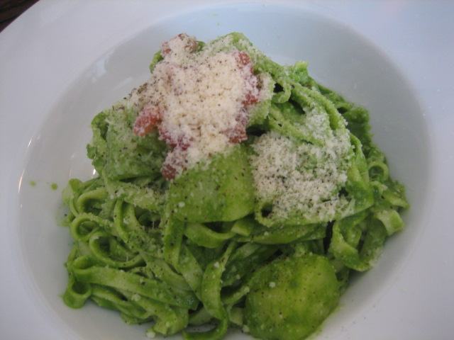 平麺のパスタはもっちり感が良く、鮮やかなルッコラの緑色が一際映える出来栄えと合わせて