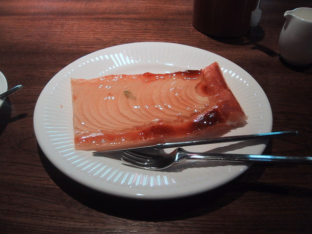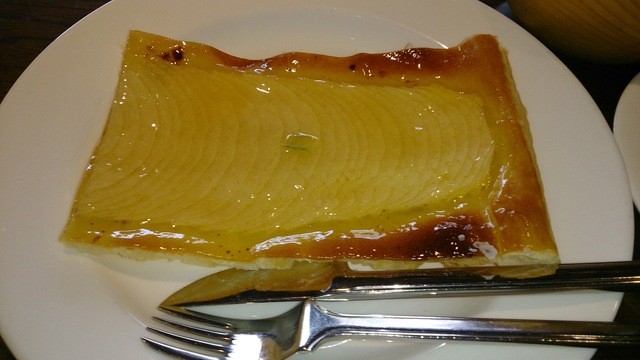今の時期は観光シーズンオフ、昼前に立ち寄ったところ店内には一組の客がいるだけの静かな雰囲気でした。今回は久し振りにアップルパイとコーヒーをテラス側の席でいただきました。薄く切られたリンゴが生地全体に敷き詰められて焼き上げられたパイは独特の美味しさがあります。尚、11月以降は季節メニューのモン・ブランが加わりますが、その画像はまた次回にアップします。