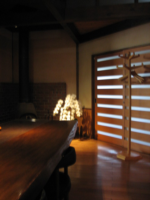 て完全に冬の装い。小雪が舞う寒い時間でしたが、暖炉で赤々と燃える薪木の炎が店内を温かく包みこ