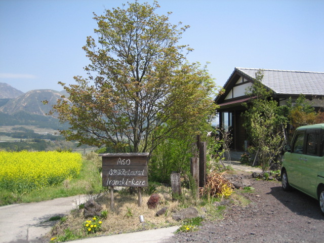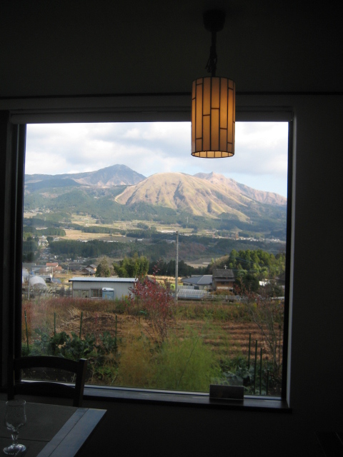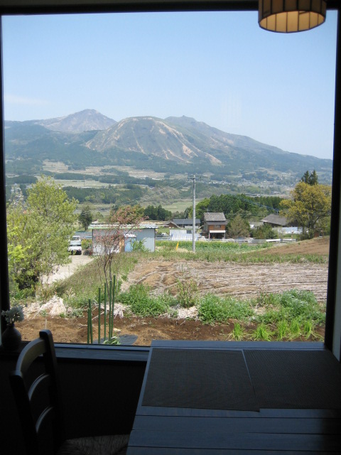伺える雰囲気、外観はごく普通の和風建築平屋建ての先に雄大な阿蘇山