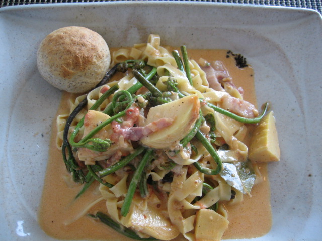 パスタはタリアテッレ(平麺)のクリームソース、自家製パンが添えられており
