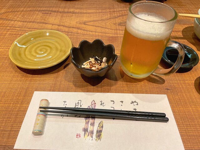 先ずは生ビールに、鶏肉と刻み昆布のお通しで、乾杯。お疲れ様でした。